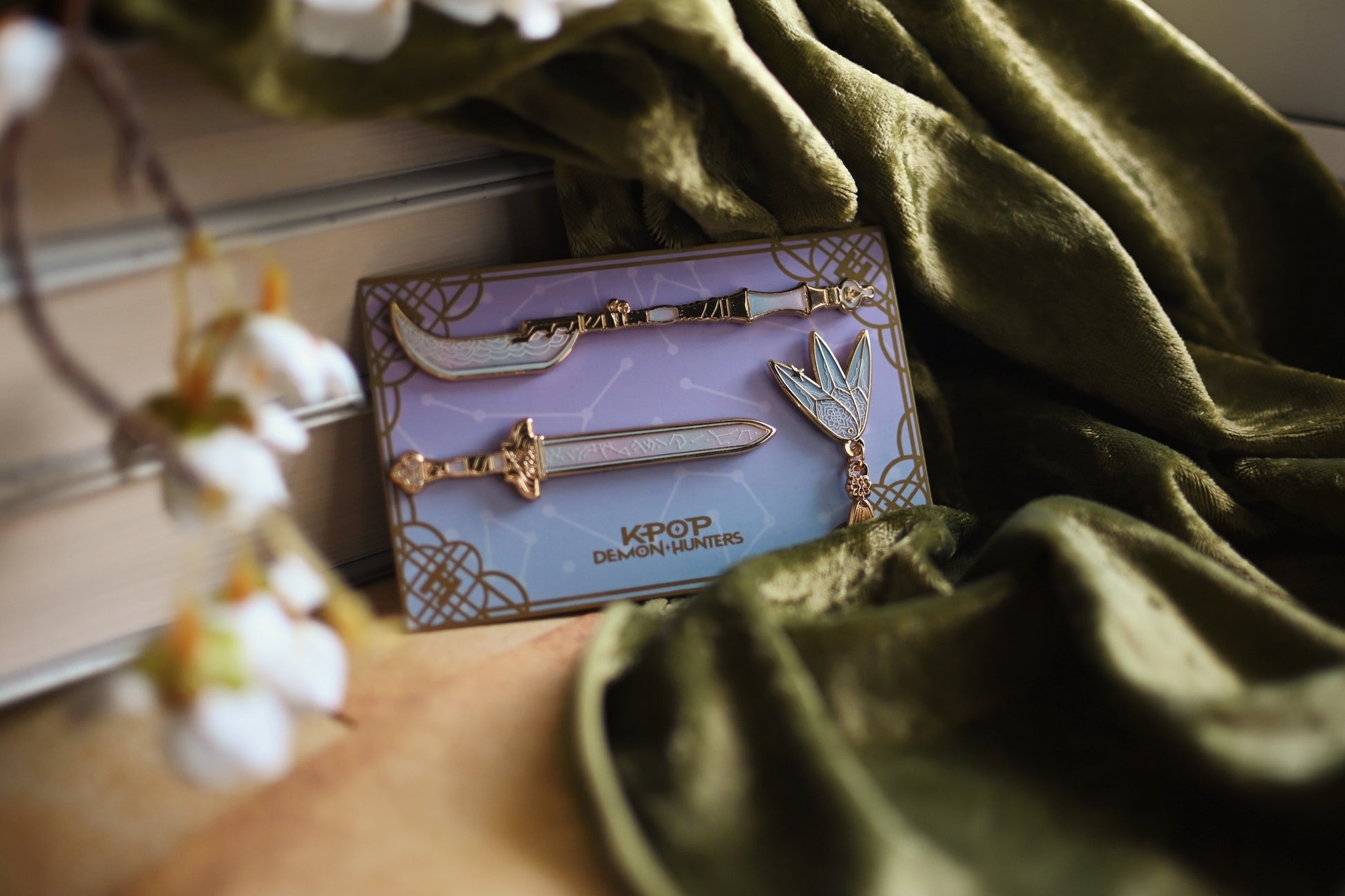 - The set is made up of three enamel pins inspired by KPop Demon Hunters featuring Rumi's Sword, Mira's Moonbeam Sword and Zoey's knife set.