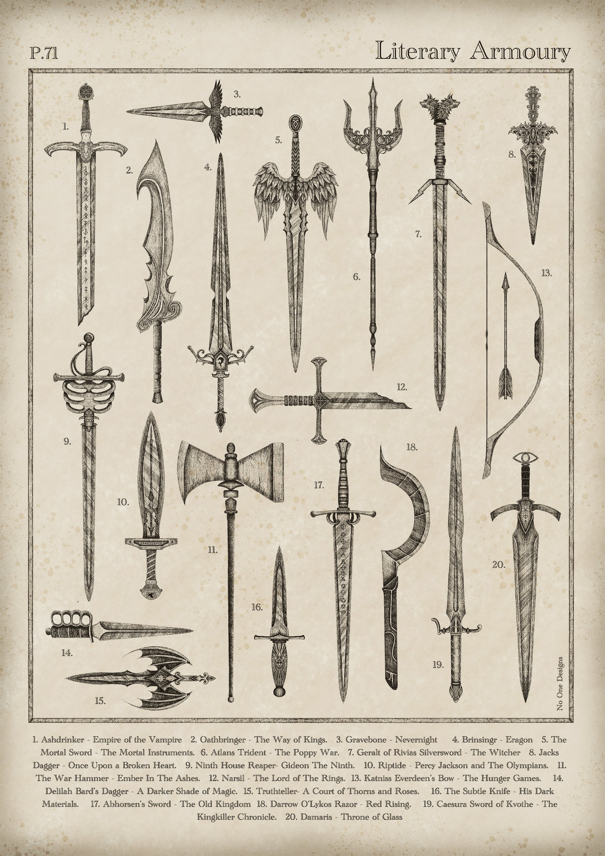 Inspired by everyones favourite fantasy and sci fi books i've created an armoury print as if it was ripped out of a vintage history book from the 1900's.